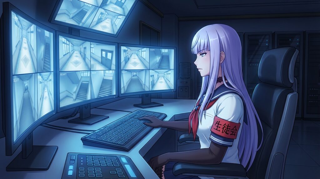 Megami Saikou is an EXTREME threat. She is the only rival who is fully aware of the danger present at the school from the moment she arrives. Her gameplay role is designed to be the ultimate test of a predator’s skills. She is surrounded by the Student Council—trained enforcers who act as her eyes and ears. She herself is a master of martial arts, capable of instantly neutralizing any physical threat. In the 202X timeline, she represents the peak of technological and social defense.