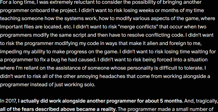 A false accusation like this one is especially damaging, because it causes programmers to think, “Oh, he fires people for fixing his code? I guess I won’t ever try to work for him, then.” As a result, no programmers reach out to offer help to me, which harms the game’s development.