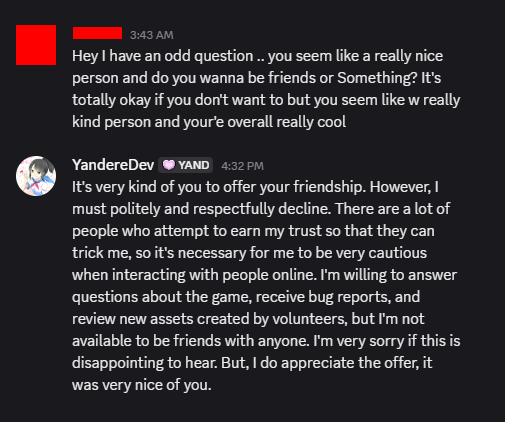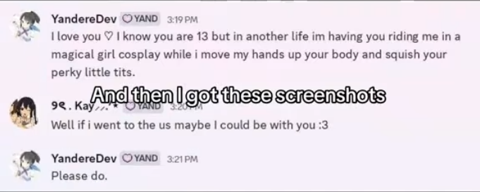 They got pissed at me for blocking them, so they made a bunch of fake “YandereDev is grooming me!” screenshots and uploaded a video to frame me as a child predator.
