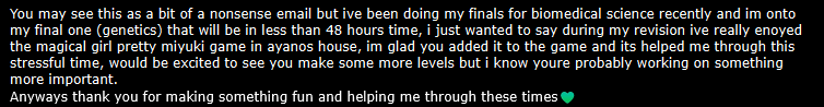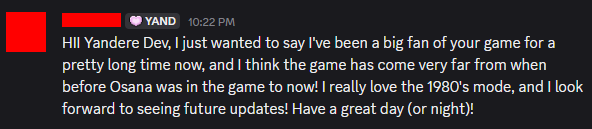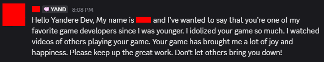 If it wasn’t for the people who DM me and e-mail me and leave comments just to say something nice, maybe I really would have given up by now. It’s because of these people that Yandere Simulator is still in development.
