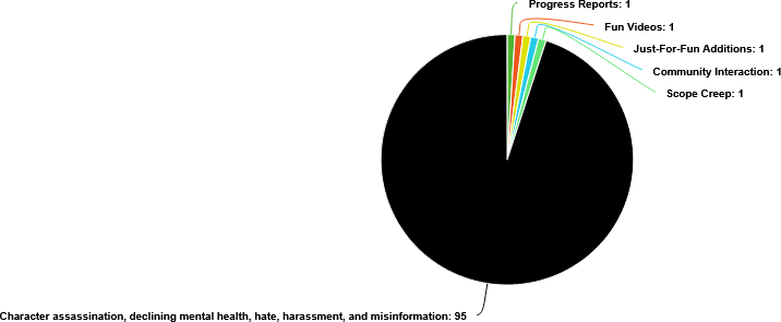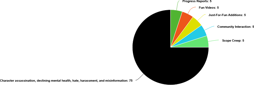 The worst part is that these problems compound on each other. If one YouTuber spreads misinformation about you and gets a lot of views, a bunch of other YouTubers will copy what he’s doing, because they want those delicious clicks and ad revenue. If one project member quits, his friends will probably quit too. If your declining mental health causes you to work slower, then people will harass you for working slowly, which will make your mental health suffer more.