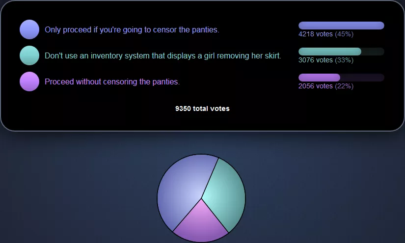 Yesterday, I proposed the idea of a grid-based inventory system that is presented to the player as the protagonist opening up her skirt to expose weapons and items hidden inside of her skirt – and also expose her panties. I was not certain whether or not this kind of presentation would be considered distasteful, so I decided to poll the fanbase about it. Here are the results of that poll:
