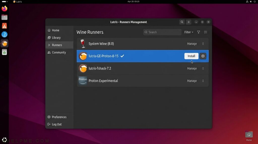 This step ensures Lutris is installed and has a Wine runner available. Lutris uses “runners” (different Wine builds) to improve compatibility, and many users choose a compatibility-focused runner for better results.