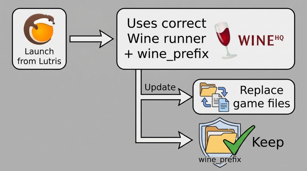 This step explains the day-to-day routine: always launch from Lutris so the correct Wine prefix and runner are used, and handle updates by replacing game files while keeping your prefix (if you want to preserve your configured environment).