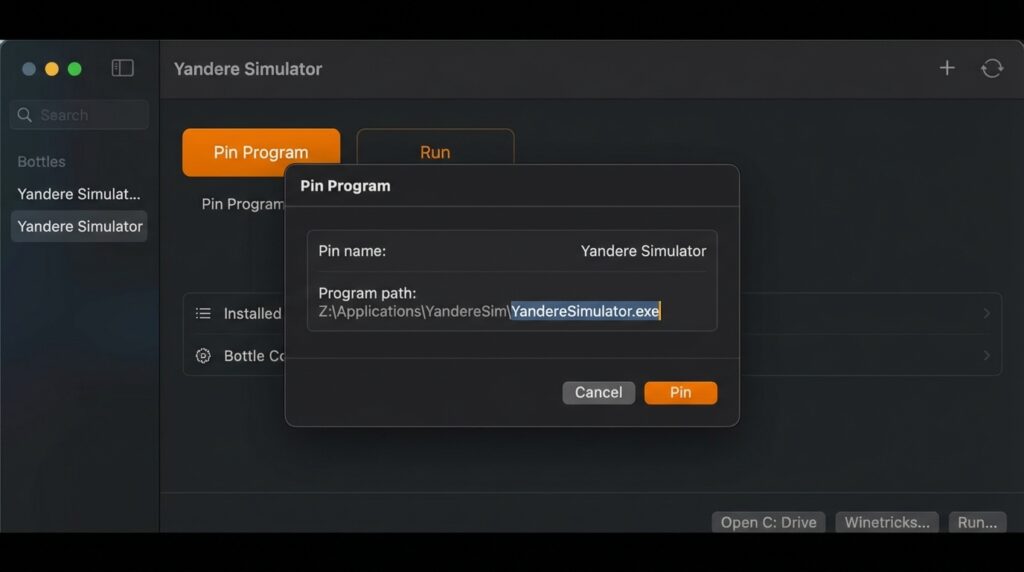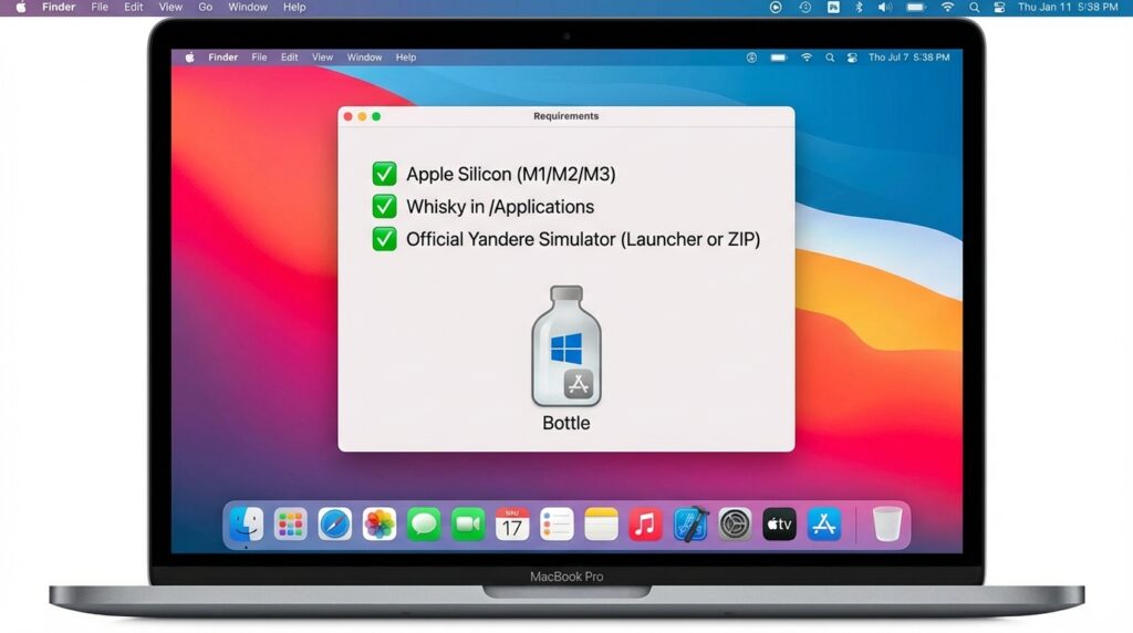 This guide walks you through installing and running the official Windows version of Yandere Simulator on an Apple Silicon Mac using Whisky, an app that simplifies running Windows programs through Wine and Apple’s Game Porting Toolkit inside Windows-style containers called bottles.