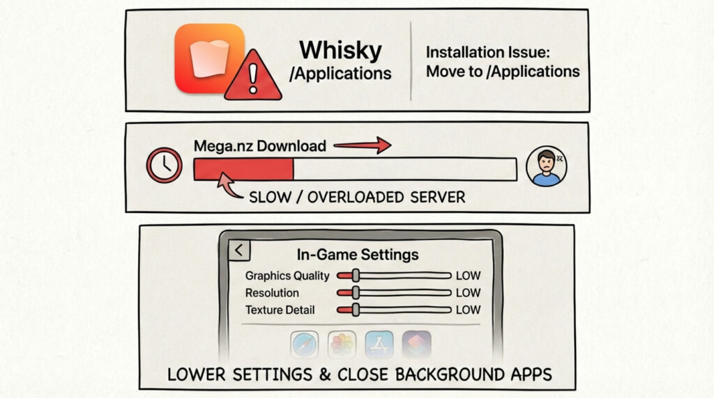 This step helps you fix the most common problems people run into when installing or launching Whisky, downloading through the launcher, or dealing with performance limitations.