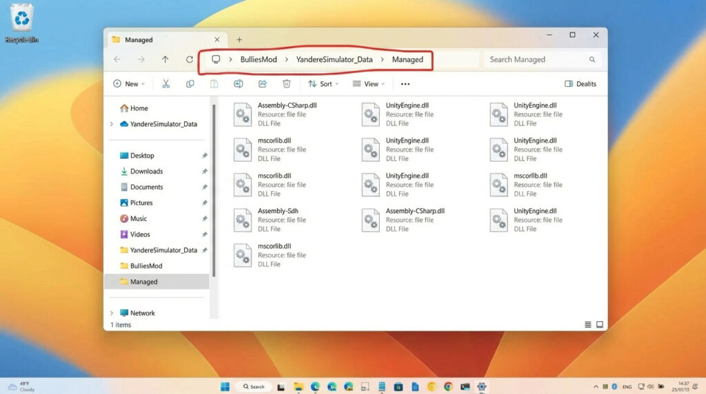 - The folder name must match this path exactly: BulliesMod/YandereSimulator_Data/Managed.